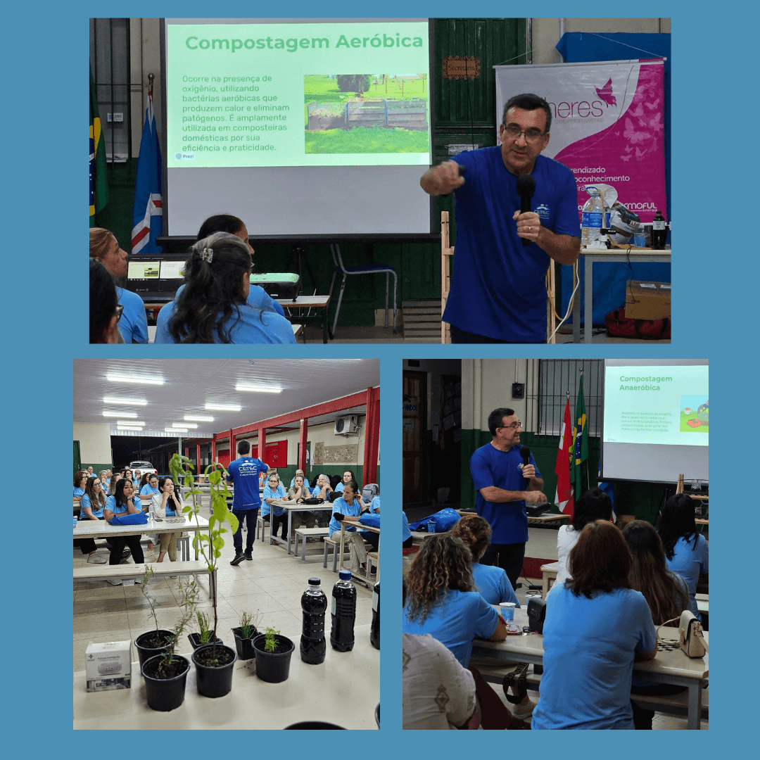 Além disso, a prática seguiu com a montagem de vasos com mudas, gentilmente disponibilizadas pelo CETEC, permitindo que cada participante levasse para casa um pedacinho verde para continuar cultivando. Outro momento marcante foi a construção de uma composteira doméstica, feita em um galão de 20 litros com a base adaptada de um bebedouro, permitindo a retirada do adubo líquido orgânico produzido na compostagem. O processo utilizou minhocas californianas, fundamentais para acelerar a decomposição e gerar um adubo de excelente qualidade.