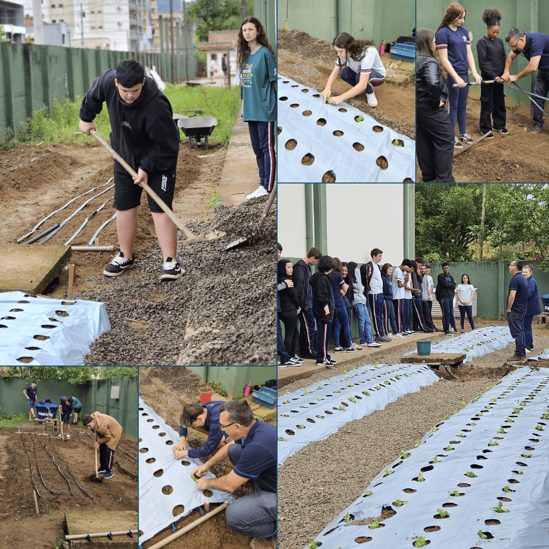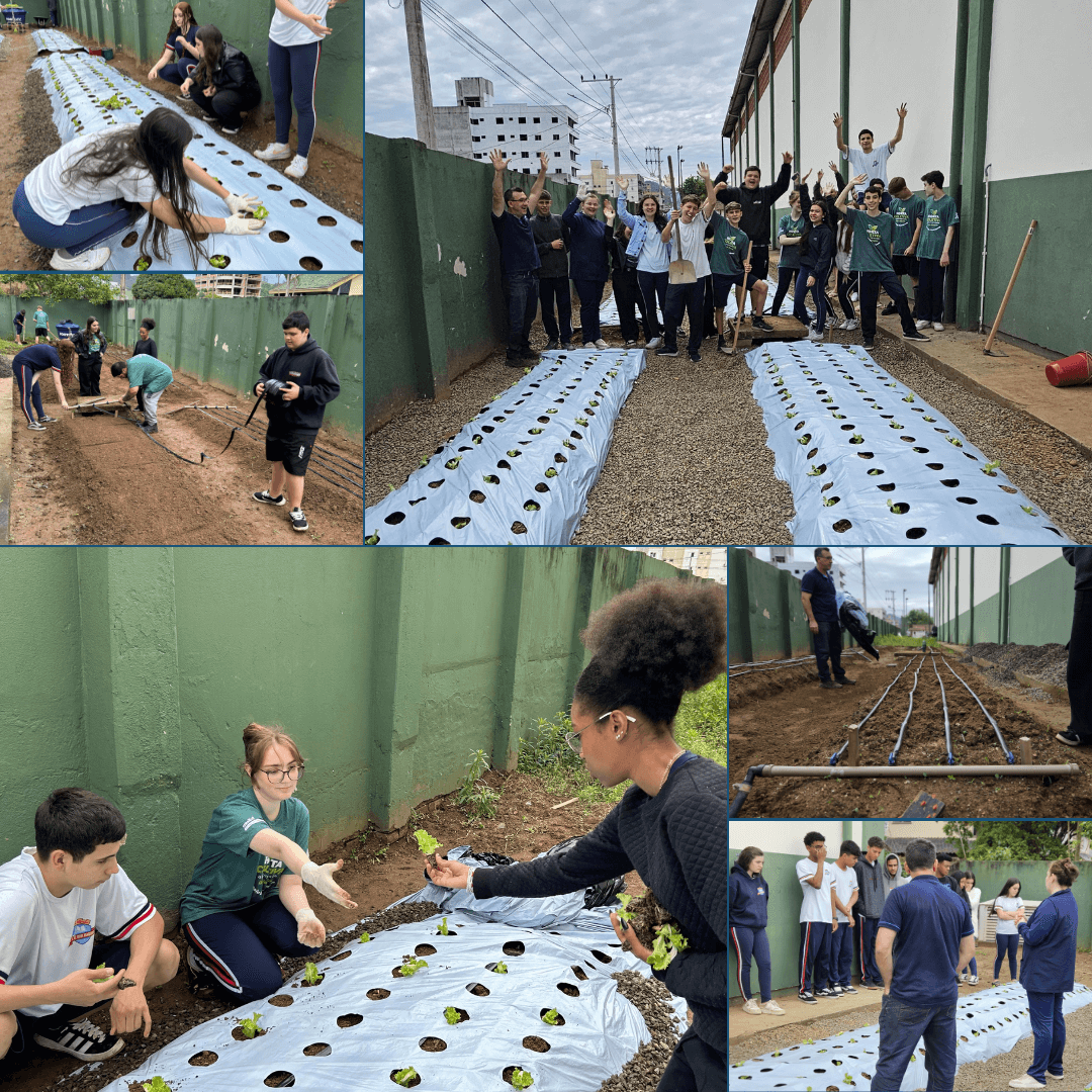 Antes de plantar, os estudantes concluíram toda a preparação dos canteiros e finalizaram a montagem do sistema de irrigação por gotejamento, além de toda a parte hidráulica que garante o funcionamento eficiente da horta.